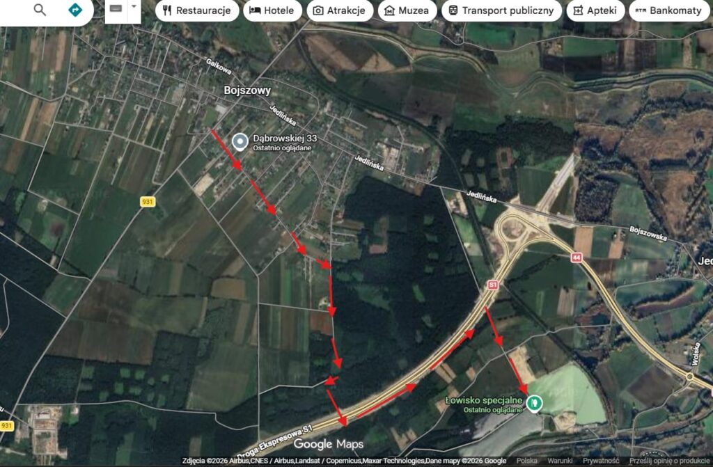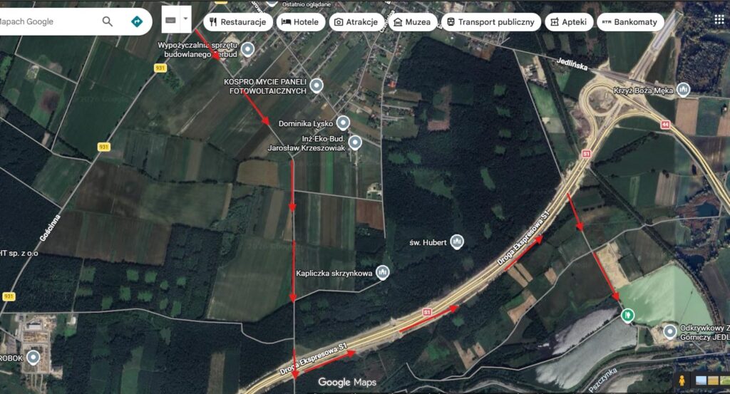 Drugi dojazd od Bojszów praktycznie w większości asfaltem jest to dojazd ul. Starowiejską. Z głównej drogi w Bojszowach skręcacie w Starowiejską. Przyjeżdżacie pod wiaduktem na S1 w lewo na drogę techniczną.