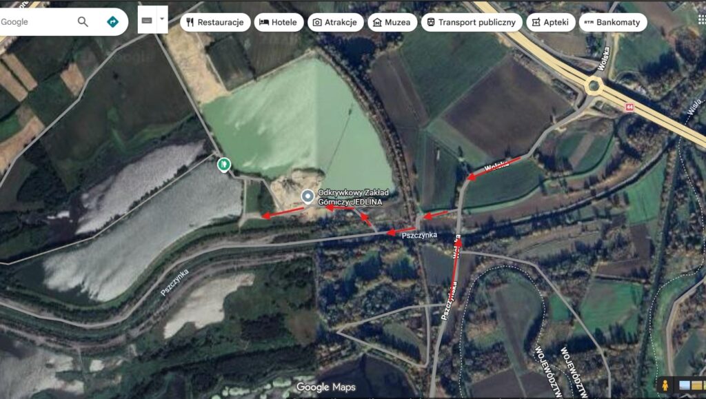 Po prawej miniecie zakład odkrywkowy Jedlina. Nasz zbiornik jest zaraz za żwirownią.